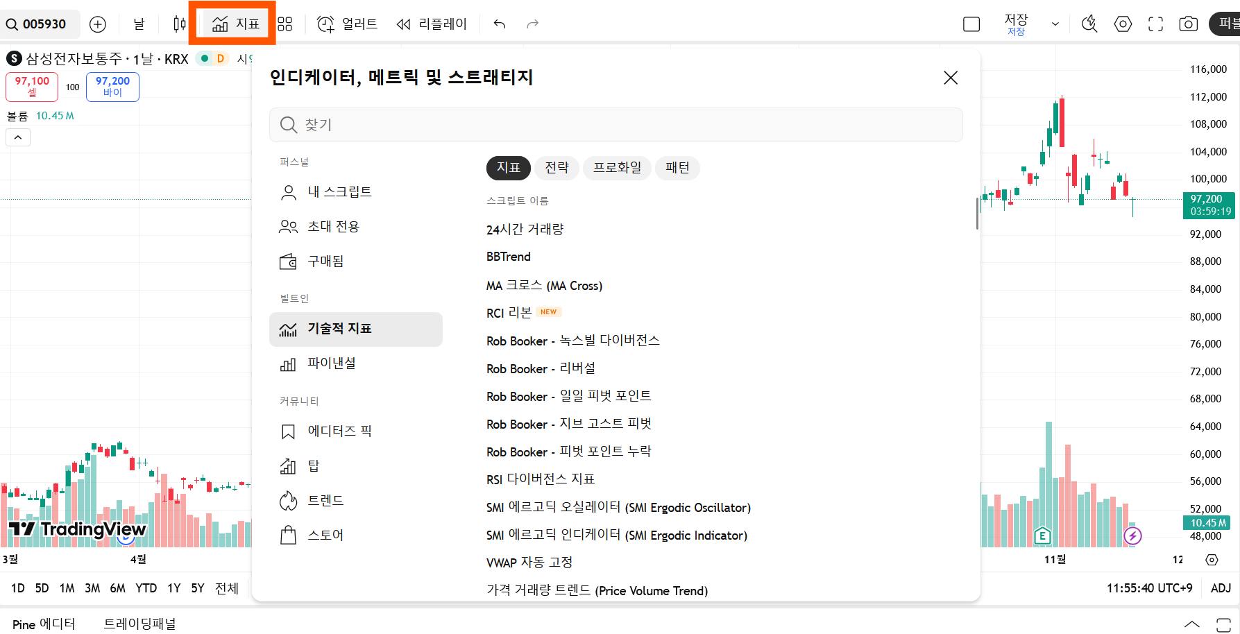 기본적으로 트레이딩뷰에서 제공하는 기술적 지표뿐 아니라 남들이 공유한 커뮤니티 지표들도 사용할 있고, 본인 스스로 만들 수도 있습니다.