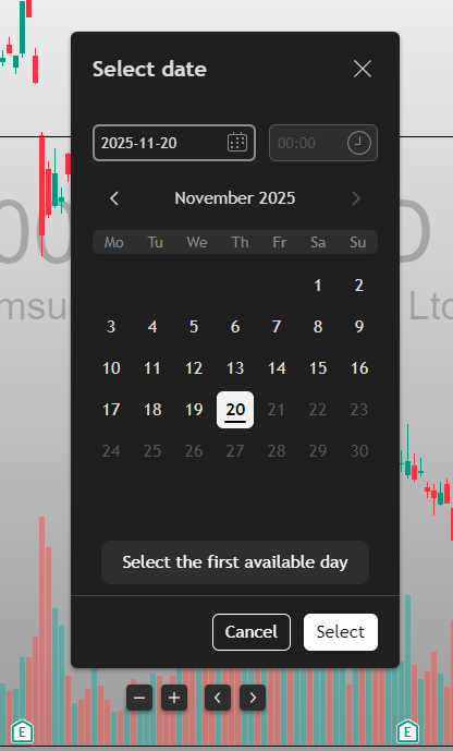 'Select the first available date'를 누르시면 리플레이 재생이 가능한 첫번째 캔들로 이동되는데요,