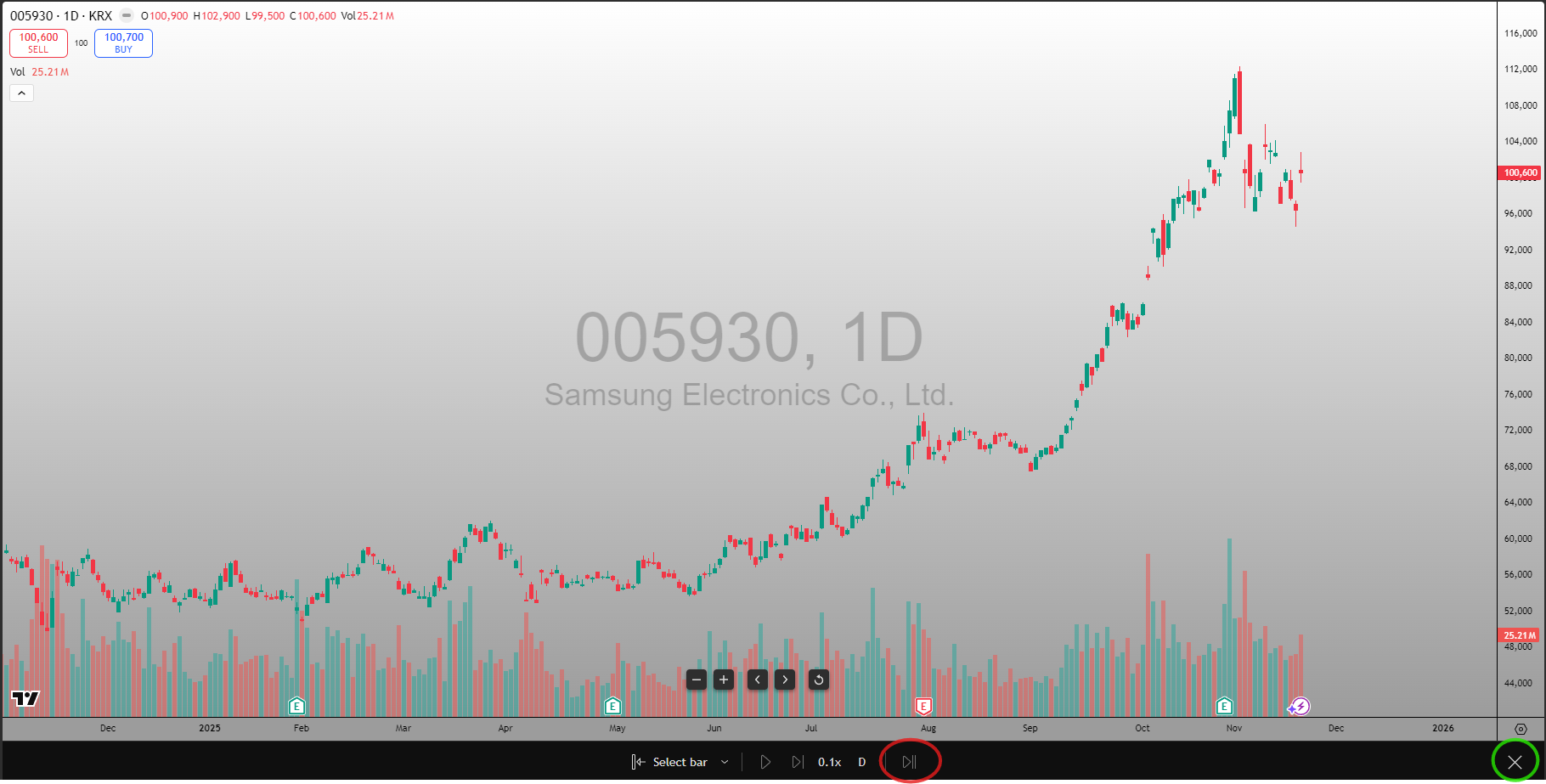 마지막으로 아래 스크린샷에 빨간색 동그라미로 표시된 버튼을 누르면 현재(실시간) 차트로 순간이동되고 초록색 동그라미 버튼(X 버튼)을 누르면 리플레이 기능을 끌 수 있습니다.