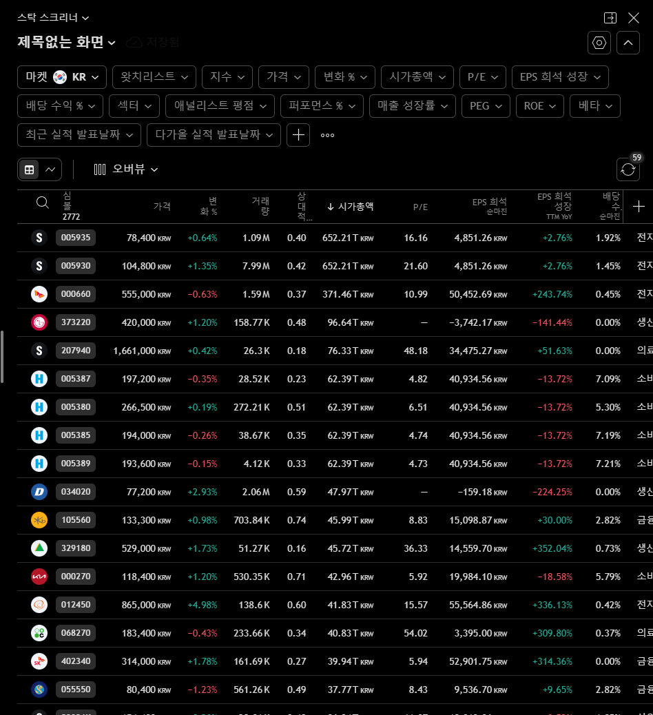 본인이 정한 조건대로 종목들을 찾아주는 기능입니다. 이 기능에 대해서는 추후에 더 자세히 다뤄보도록 하겠습니다.
