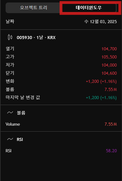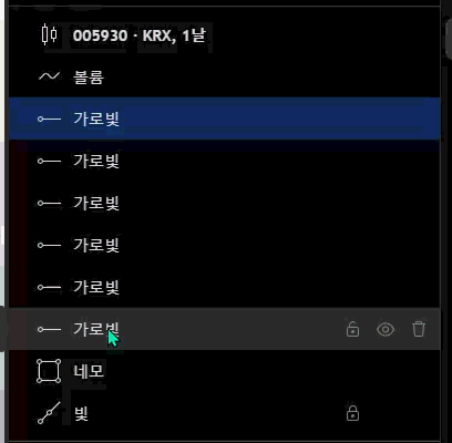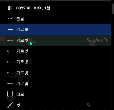이곳에서 사용자가 그린 모든 오브젝트들(추세선 등)과 지표를 관리할 수 있습니다.