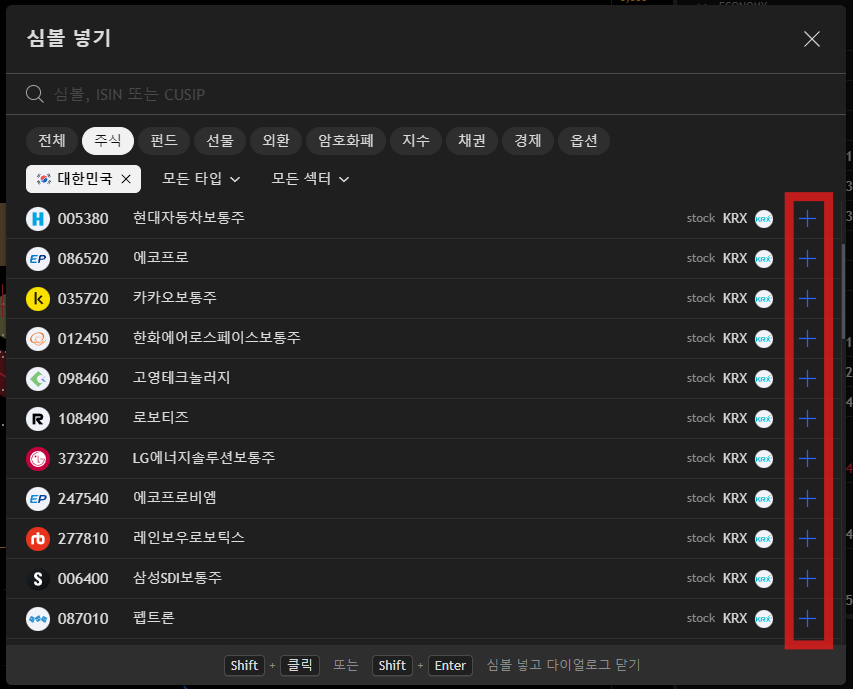 이후 원하시는 종목을 찾으신 후, 우측에 '+' 버튼을 눌러서 추가하시면 됩니다.