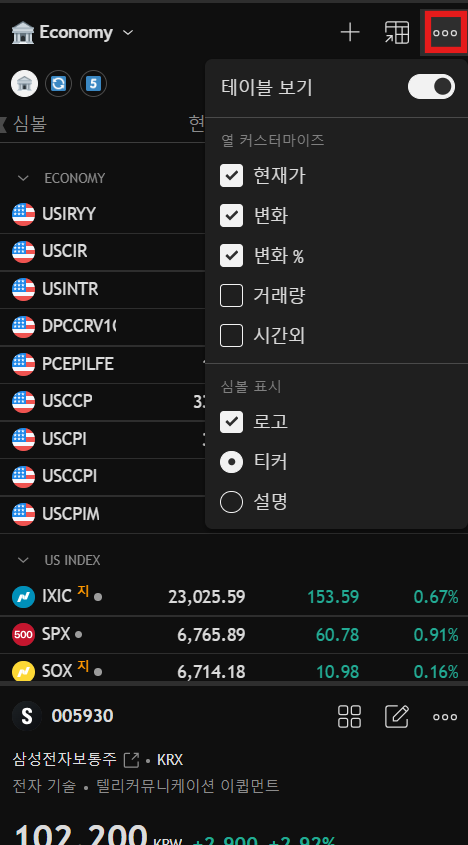 [열 커스터마이즈]를 통해 현재가, 가격 변동, 가격 변동(%), 거래량 등 다양한 값을 테이블에 보이거나 숨길 수 있습니다.